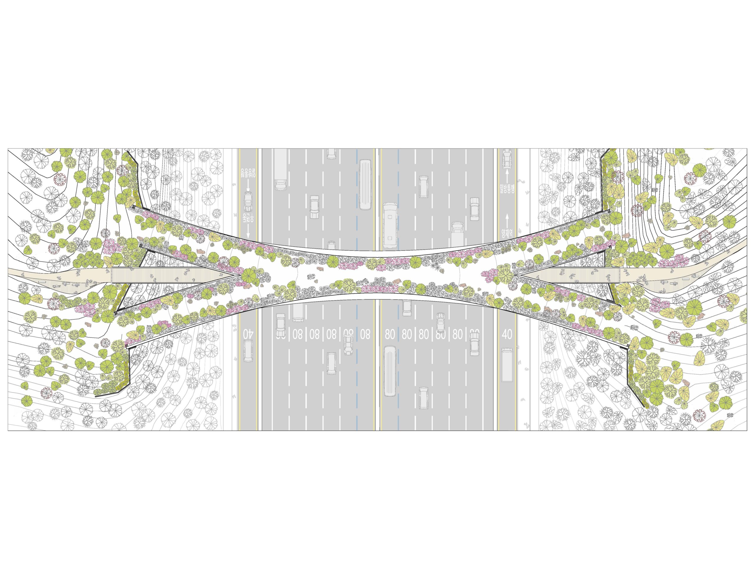 배식은 기본적인 생태적 배식으로, 지역 자생종과 식생구조를 고려하여 숲 가장자리 부분과 생태다리 양측을 따라 이어지는 부분은 교목, 관목, 초화를 통한 다층구조로 식재 계획하였다. 횡적으로 이어지는 다리 양쪽경계부위는 다양한 관목과 아교목 위주로 한 다층의 울타리형 차폐식재를 도입한다. 이러한 선형의 다층 차폐식재는 하부 고속도로의 불빛을 차단하는 역할 뿐만 아니라 울타리에 서식하는 소동물의 이동이나 은신처 역할을 겸할 수 있고 생물종다양성이 높다는 장점이 있다.
