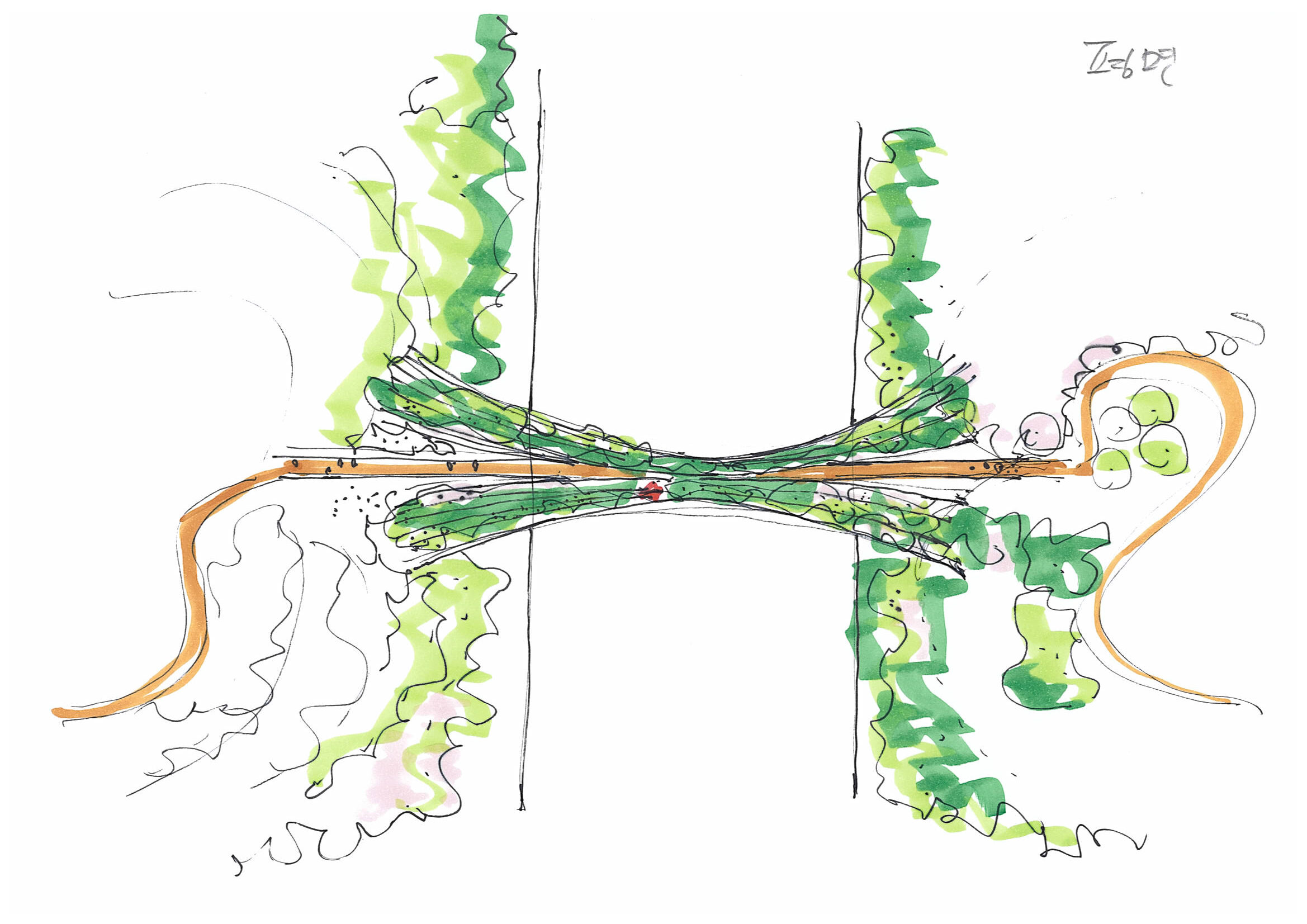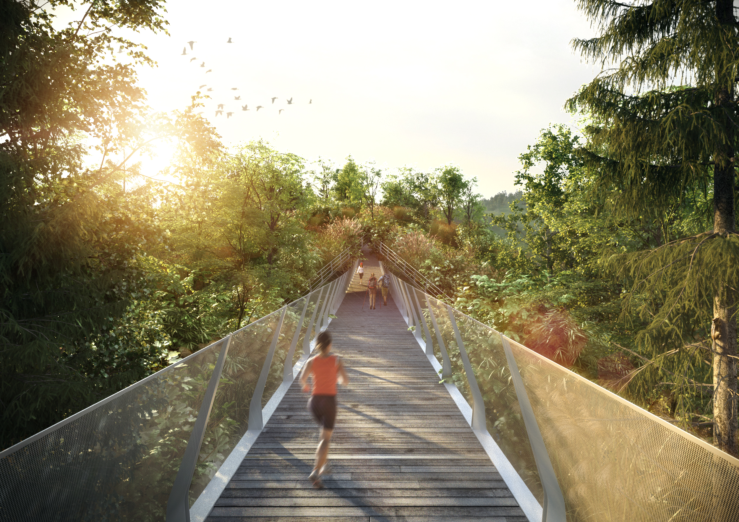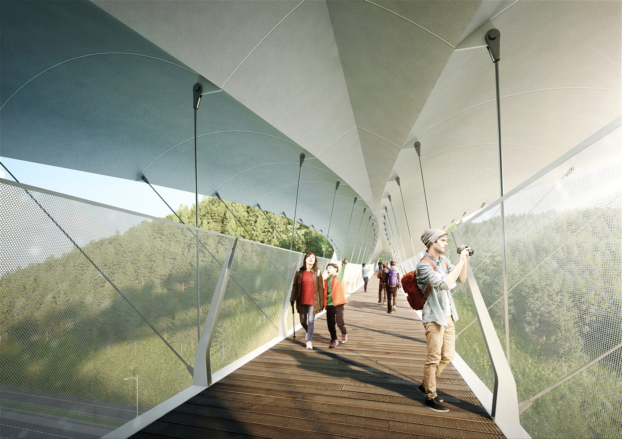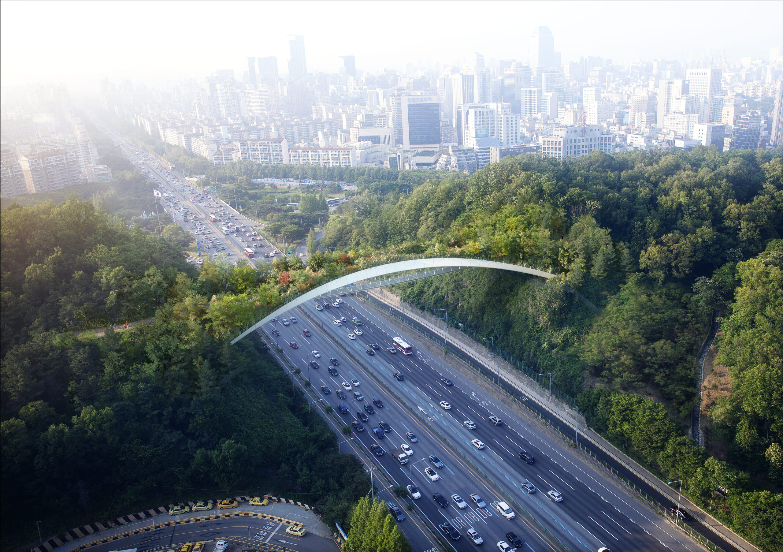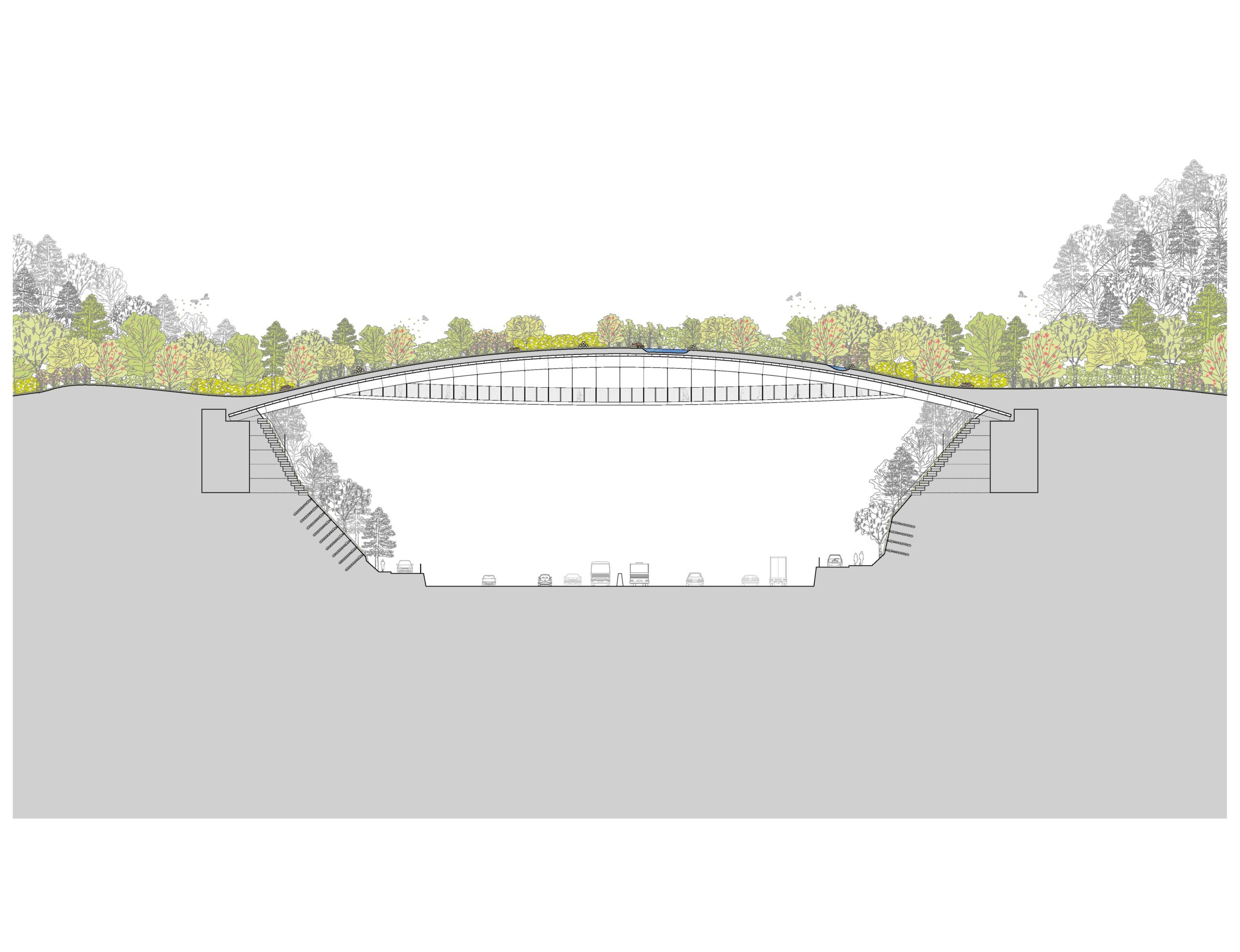 생태적으로 보행로와 녹지 연결로를 분리하는 원칙하에, 아치 단면은 도로상부 105미터를 큰 두개의 아치가 쌍으로 가로지르며, 횡력 저항력이 높은 효과적인 구조이다. 보행로는 쌍아치 사이에 매달려 녹지 연결로와 분리되면서, 보행자들에게 다양하고 입체적인 전망을 제공한다. 보행로 난간은 안전을 위해 1.8미터 다공철판(punched metal)로 계획하였다. 쉘형 구조인 모노코크(monocoque)는 구조체이면서 외피가 따로 필요 없어 별도의 무근콘크리트로 인한 하중의 증가가 없는 구조, 외피의 일체형이다. 각 아치 부재의 지오메트리(geometry)는 모두 같아 시공상 경제성을 높였다.