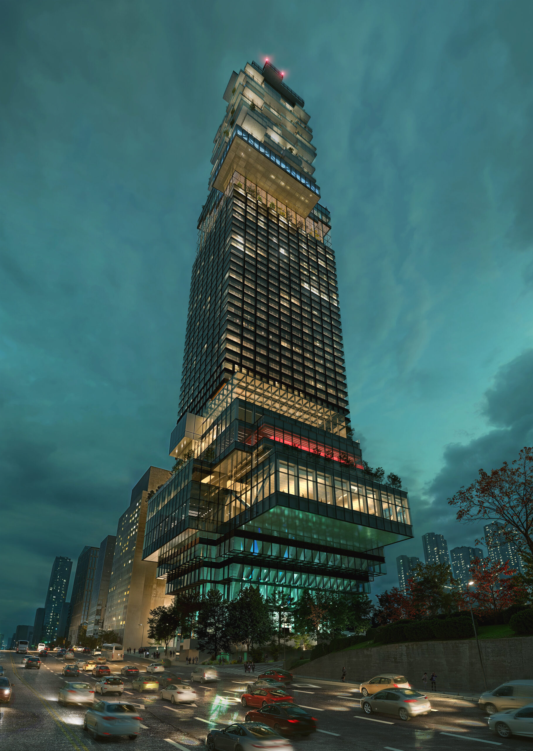 81년도 오픈한 강남최초 호텔인 더리버사이드 호텔은 높이 284.7미터, 49층 높이로 대한민국 근대화와 산업화의 상징인 경부고속도로 초입 위치하고 있다. 타워는 종묘, 세운상가 공원화, 남산, 한남대교, 경고속도로 공원화에 이어 관악산, 청계산으로 이어지는 녹지축에 위치하고 있다. 이는 미래 세대에게 녹색보행도시 인프라 구축에 있어서 중요한 촉매적 역할을 잠재하고 있다. 저층부를 역피라미드 형식으로 들어올리고 기둥 없는 매스 하부 도시숲은 역동적이고 건축 간섭없는 계획을 통해 한강변에 새로운 활력을 제공한다. 호텔 체크인과 모든 차량의 드롭 오프는 지하로 보내고, 지상에는 대지대비 20퍼센트만 점유하여BFR(Building Footprint Ratio) 지상대지는 축구장 면적에 상응하는 전례 없는 공원을 시민들에게 제공한다. 30층에 스카이 가든은 카페로 운영, 관리되며 일정시간 시민에게 개방되는 시설로 서울을 전망할 수 있는 명소가 될 것이다. 스카이 가든, 컨벤션 테라스, 도시숲 면적은 대지면적 대비 2배에 이르는 식재가능 면적(Green Area Ratio)을 제공한다. 바람과 지진 등 자연환경에 견디면서 아주 작은 토지를 점유하고 저층 햇빛과 물, 이산화탄소를 산소로 만드는 생태과정을 실현시키는 타워 ‘The Tree’는 실재 나무의 구조적, 친환경적 퍼포먼스, 시간적 변화를 드러. ‘The Tree’는 나무의 구조적 성능과 유사하며, 끊임없이 변화하는 실루엣은 나무의 무늬를 닮아 있다. 이는 단순히 나무의 형태를 상징하는 것뿐만 아니라 지속가능성과 친환경의 메시지를 내포한다. 렘 쿨하스의 ‘건축은 맨하탄의 신흥 종교이다(Architecture is Manhattan’s new religion)’의 통찰적 명제는 이제 ‘녹색은 서울의 신흥 종교이다(Green is Seoul’s new religion)’로 바뀌는 모멘텀에 본 타워가 위치하고 있다.